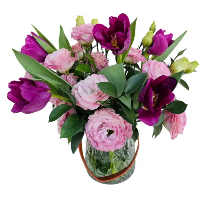 Regala flores en San Valentín. Hay bellezas que nacen para ser compartidas. Este diseño floral es un poema visual: la pulcritud de 5 Tulipanes morados se entrelaza con la dulzura de un toque de Lisianthus rosas, todo reposa con distinción en nuestro “Bolso Florero”.