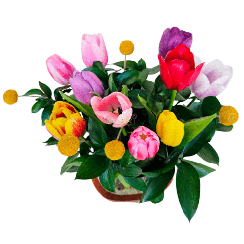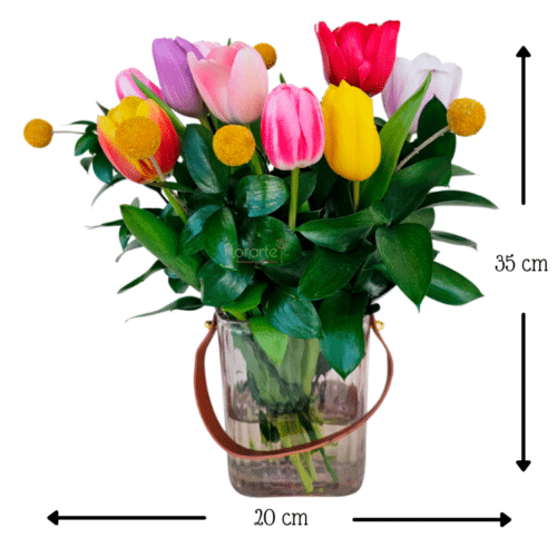 Despierta la magia al regalar flores en San Valentín: Una decena de Tulipanes multicolor y un toque de Craspedias en nuestro hermoso “Florero Bolsa”. Comprar flores es entregar poesía con nuestra entrega de flores a domicilio; envía flores hoy y envuélvela en este sueño floral.
