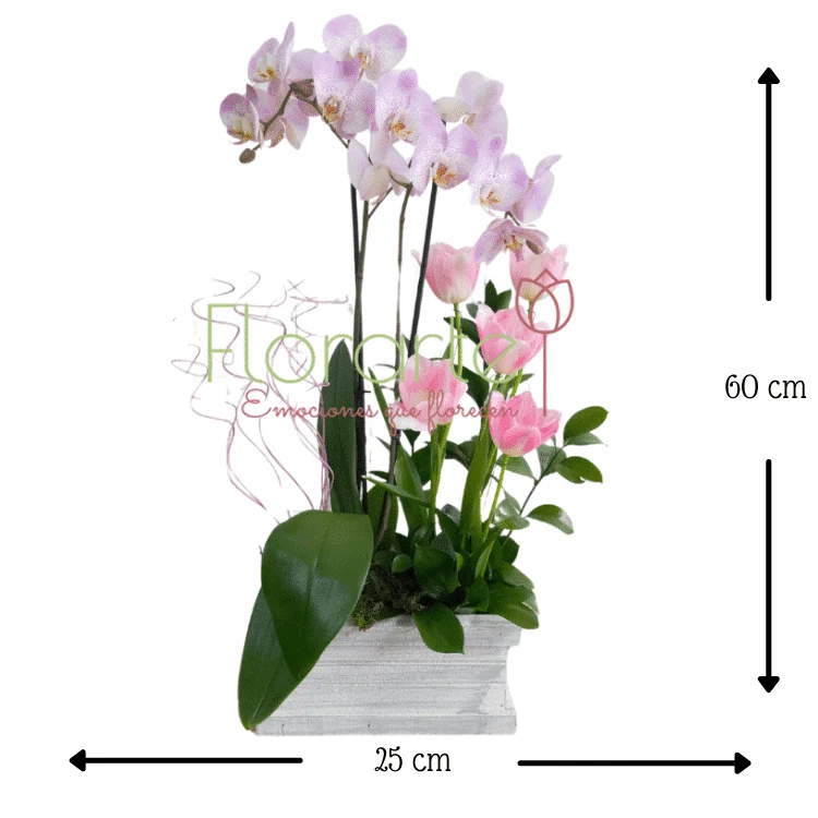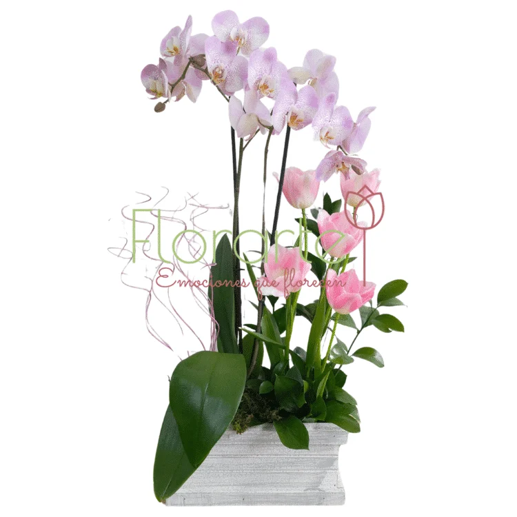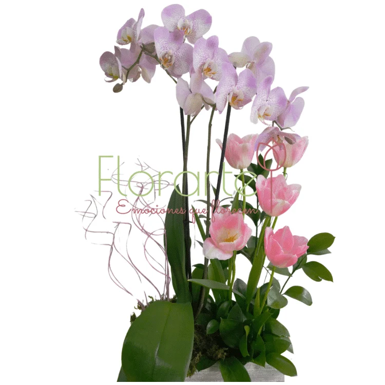 - Tulipanes, mensajeros de cariño: Cinco tulipanes frescos complementan la belleza de la orquídea, añadiendo un toque de color y alegría al conjunto.