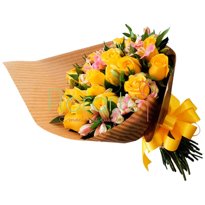 Ilumina su día y envía flores con este bonito ramo de 24 Rosas amarillas acompañada por una decena de Alstromelias en tono rosa con papel decorativo y un moño en color amarillo.