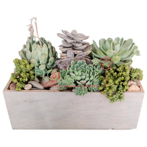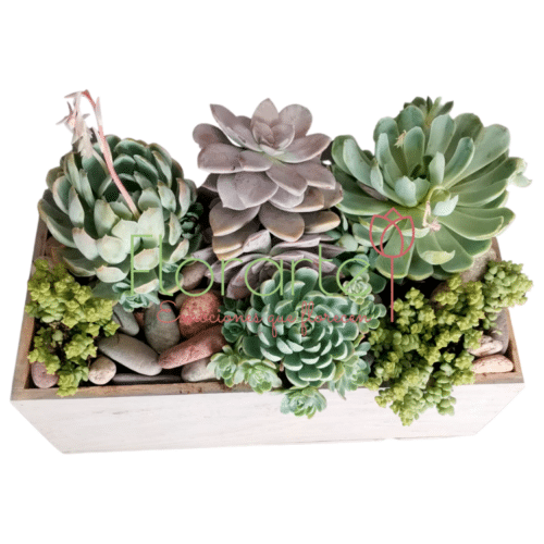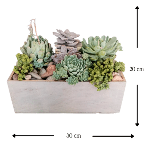 Hermoso detalle con plantas de Suculentas entre piedra de rio en una base de madera, para llenar tu espacio de energía.