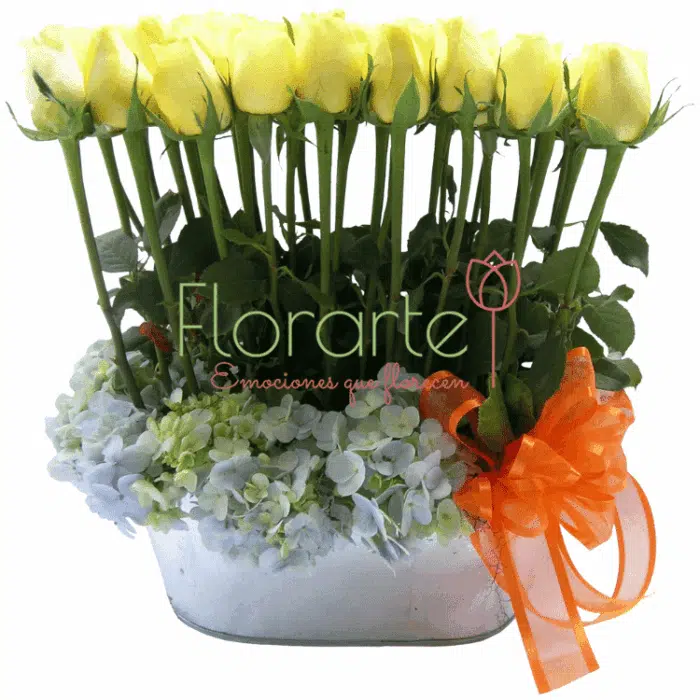 ¡Envía hermosas flores a domicilio que estan llenas de brillo, alegría y luz! Precioso arreglo elaborado con 4 docenas de Rosas de invernadero amarillas, con flor de Hortensia en la parte de abajo con un moño de tela en una jardinera de cerámica Flowers and Garden.
