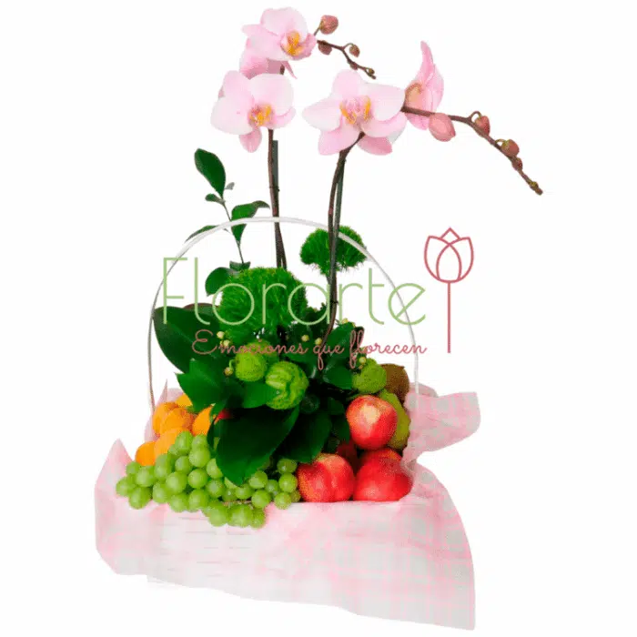 Deleita un hermoso arreglo frutal. Arreglo elaborado con Fruta de temporada acompañado de una hermosa Planta de Orquídea Phalaenopsis doble tallo entre Green, Ruscus y Bombi, en una canasta blanca.