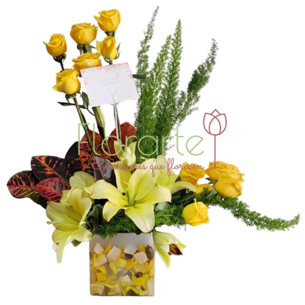 Deslumbra con este hermoso arreglo floral, donde la elegancia se encuentra con la calidez del amarillo. Envía flores con este arreglo elaborado con 12 Rosas de Invernadero amarillas, 2 tallos de Lilis amarillas entre follajes de Cola de zorro y hojas de Crotos en nuestra elegante base de cera amarilla. ¡Obsequia este símbolo de buen gusto y deja una impresión imborrable!