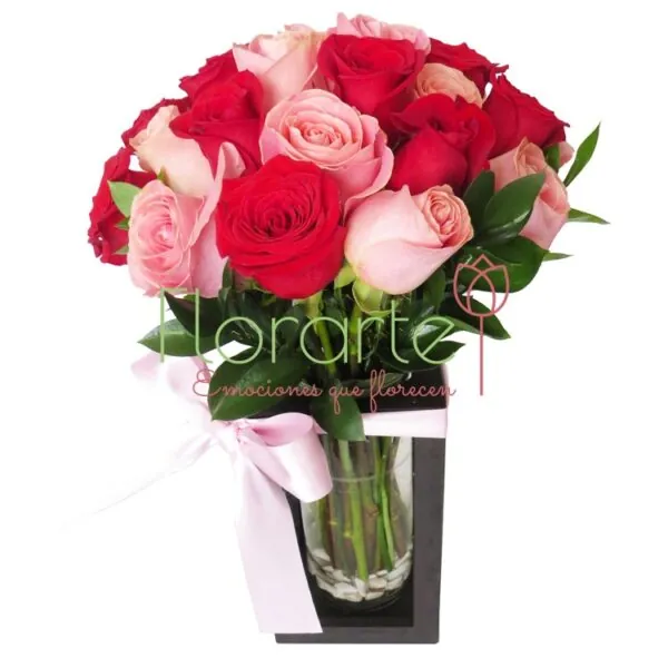 Envía preciosas flores a domicilio, arreglo en nuestra base babel, dos docenas de rosas, una docena en rosado y otra en rojo entre follaje de ruscus y atado de listón de tela al cuello de la base.