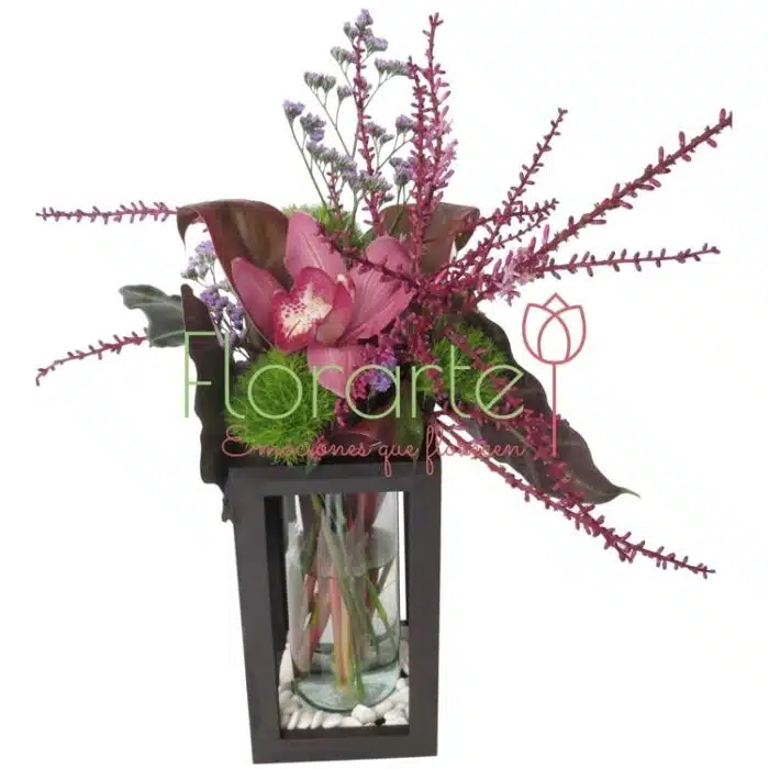 Envía más que flores. Hermosa orquídea Cymbidium que seguro le encantará ¡envíala ahora! Acompañada con follajes exóticos. Va en su base babel de madera con vidrio.