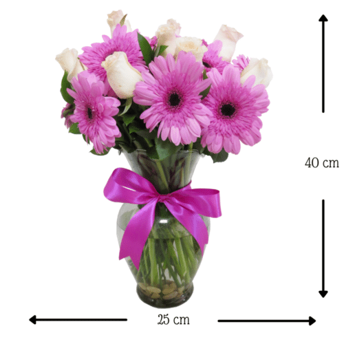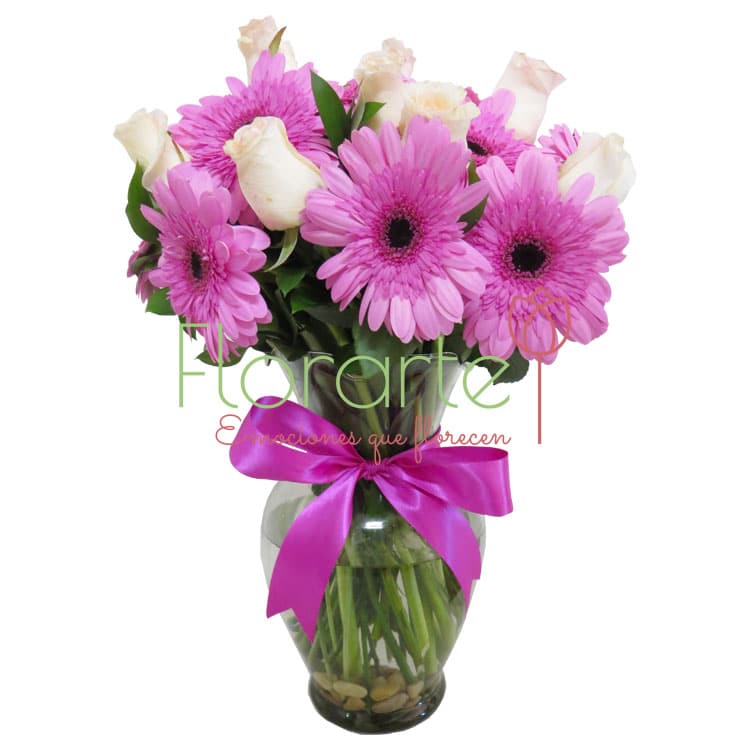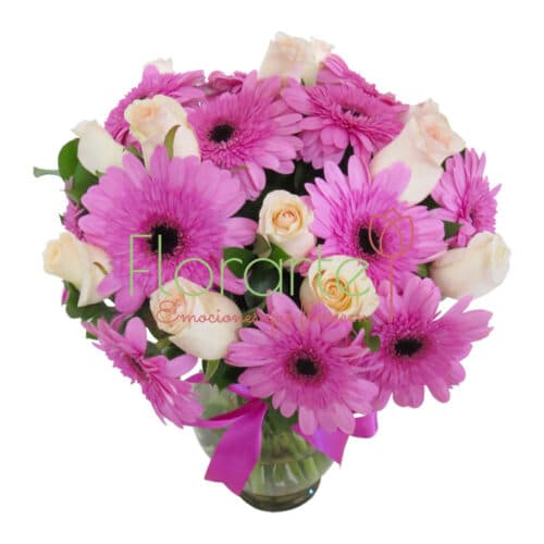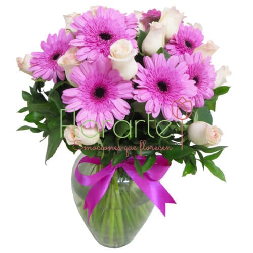 Envía estas bellas flores, una decena de Gerberas lilas y una docena de Rosas pálidas, una bella combinación para enternecer el alma.