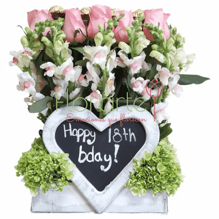 ¡Envia flores que con su color cautivaran a esa persona especial! Elegante arreglo elaborado con 25 Rosas de invernadero rosas agrazadas por Flor de Matiola en doble color (rosa y blanco) entre 16 Chocolates Ferrero con Flor de Hortensia en una base de corazòn de madera terminado vintage.