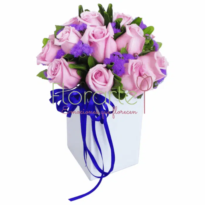 ¡Envia flores con este diseño lleno de dulzura para esa persona especial! Bello arreglo elaborado con 2 docenas de Rosas de invernadero rosas entre una decena de Leatriz con un toque de follaje de Ruscus con una base de cerámica blanca con un moño de tela azul para darle un excelente contraste.
