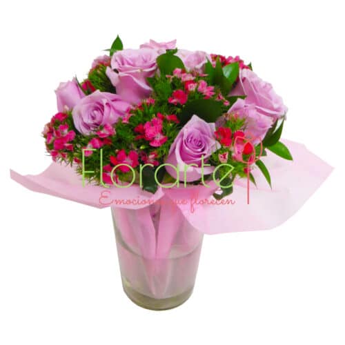 $960.00Flores a domicilio hermosas y tiernas. Dos docenas de rosas lilas, con tres Anturios rosados, follaje de Ruscus, complementos de carrizo quemado, curly blanco, y gravilla de mármol en una base de cerámica chocolate.