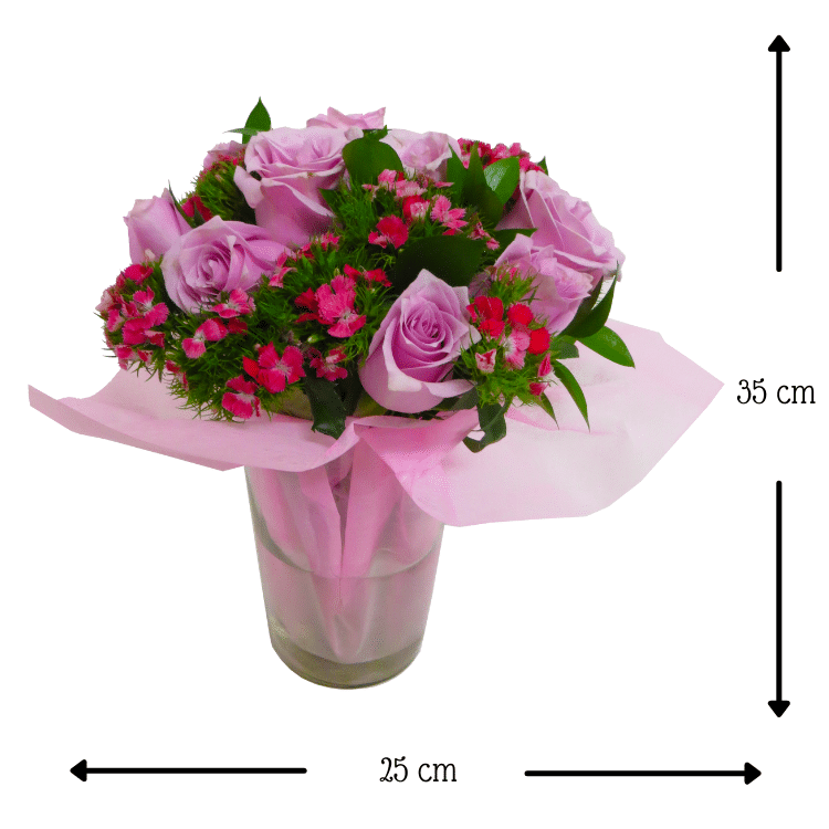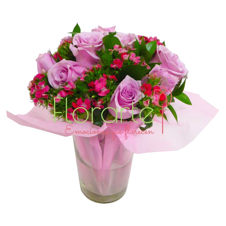 Envía más que flores, hermoso diseño en bouquet, una docena de preciosas Rosas naútica entre una decena de tallos de flor de Dianthus, en un florero de vidrio fondeado con papel coreano tono pastel.