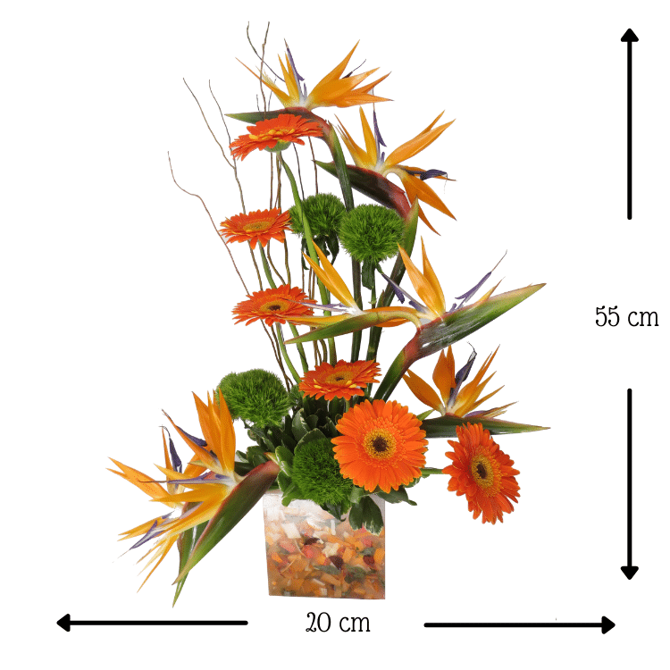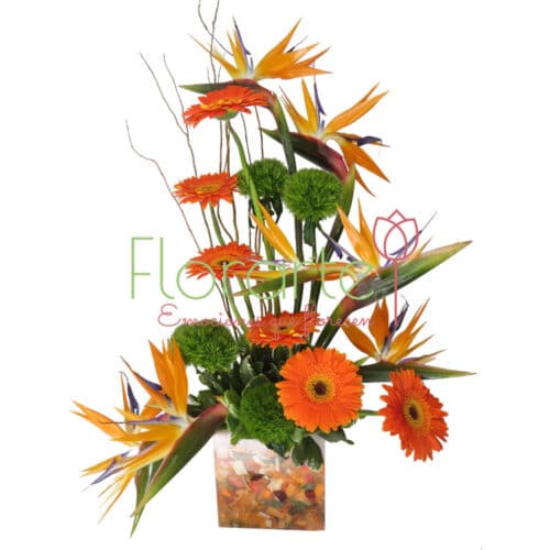 ¡Envía más que flores a domicilio! Diseño floral con media docena de Aves del Paraíso, media docena de Gerberas y media decena de tallos de Green y follaje de clavo japones en nuestra base de cera Florencia.