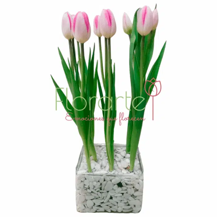 Regala flores elegantes que simbolizan pureza y candidez. Precioso arreglo elaborado con una decena de Tulipanes color rosa en un cubo de vidrio con piedra marmolada en tono blanco.
