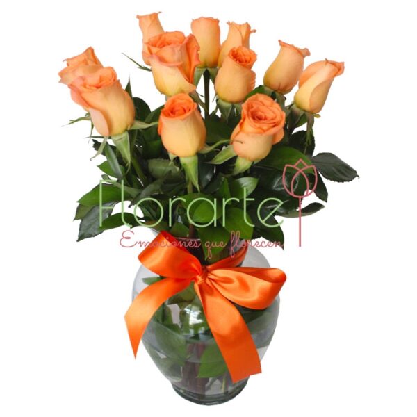 Envía grandioso diseño floral. Una docena de hermosas Rosas de tono naranja vivo, en un jarrón de vidrio con listón de tela naranja. Le encantarán.