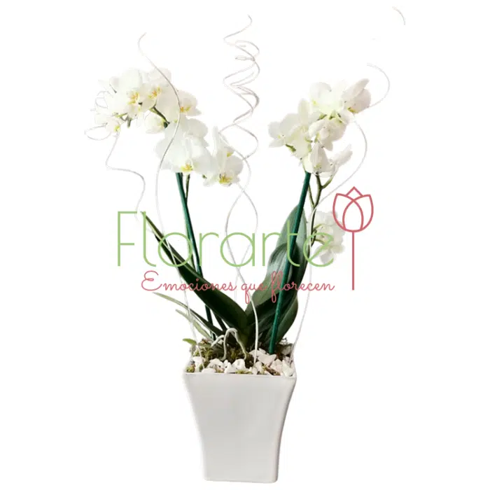 Envía flores bonitas y duraderas, una planta de orquídea Phalaenopsis doble tallo en color blanca en una base de cerámica fina con varas de curli willow de palma y musgo.