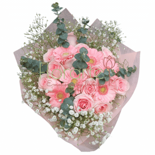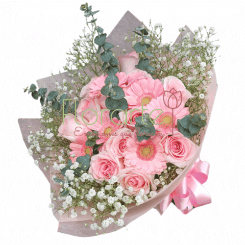 Regala flores de Gerberas con Rosas que seguro le encantarán. Elegante bonito y sencillo ramo, elaborado con 5 Gerberas rosas entre 1 docena de Rosas de Invernadero rosas con un toque de follaje de Dólar y Baby con papel en tono rosa y un moño de tela.
