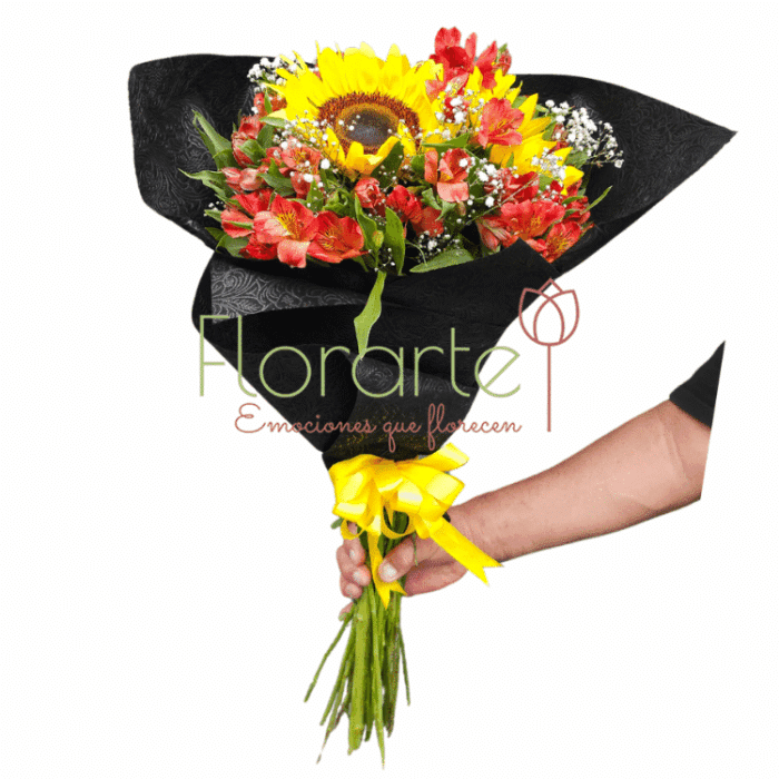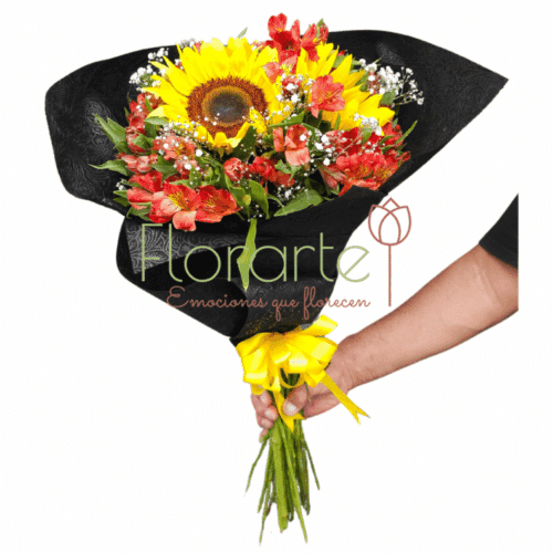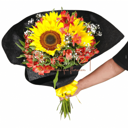 Regala flores a domicilio llenas de amor y alegria con nuestra elegante combinación de 3 Girasoles entre Alstromelias rojas con un toque de Baby en forma de ramo abrazado por papel coreano negro con un elegante moño de tela.