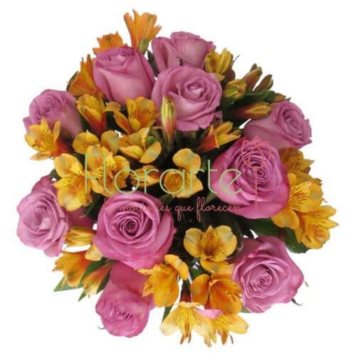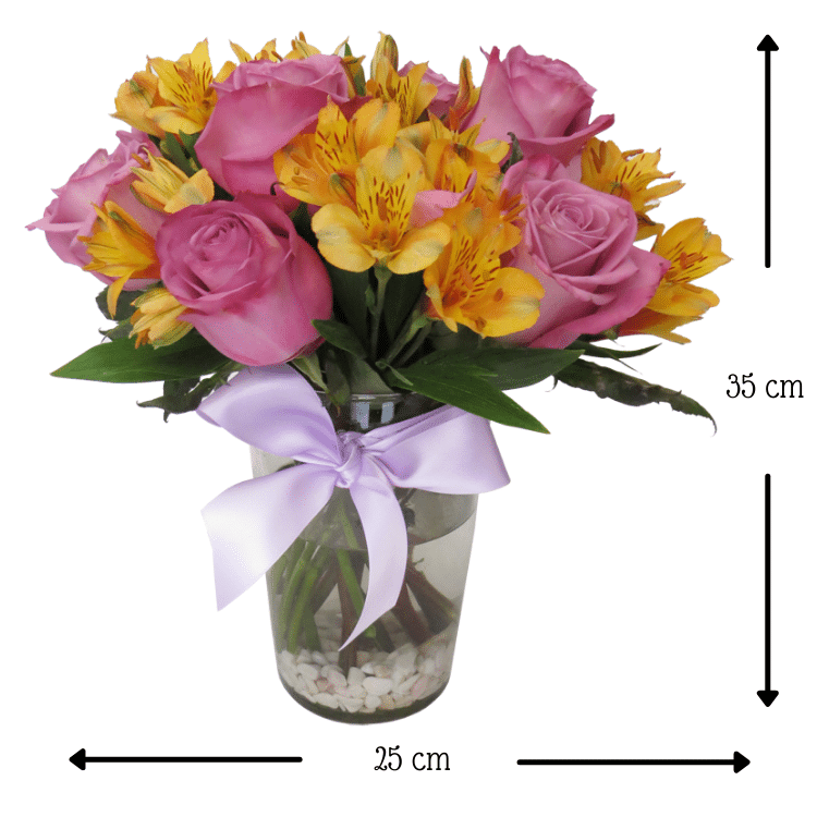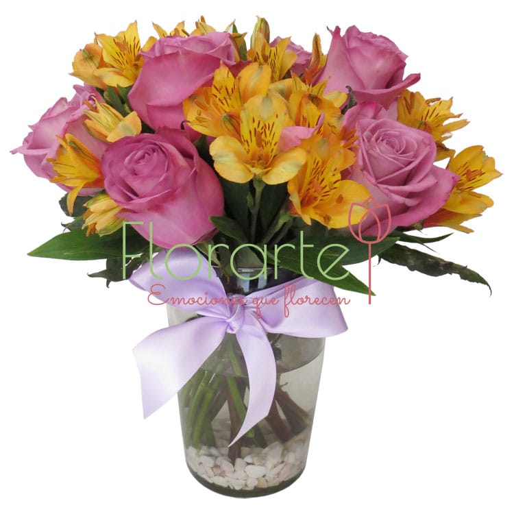 Envía Flores hermosas el mismo día, una decena de hermosas Rosas lilas entre Alstromelias amarillas en un florero de vidrio y listón de tela lila.