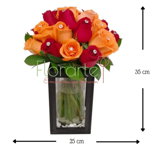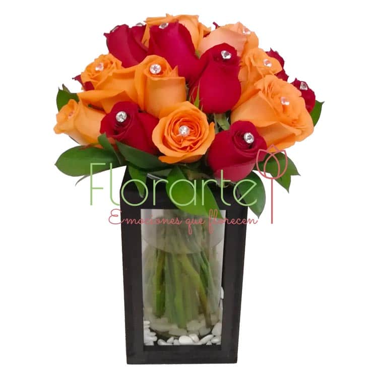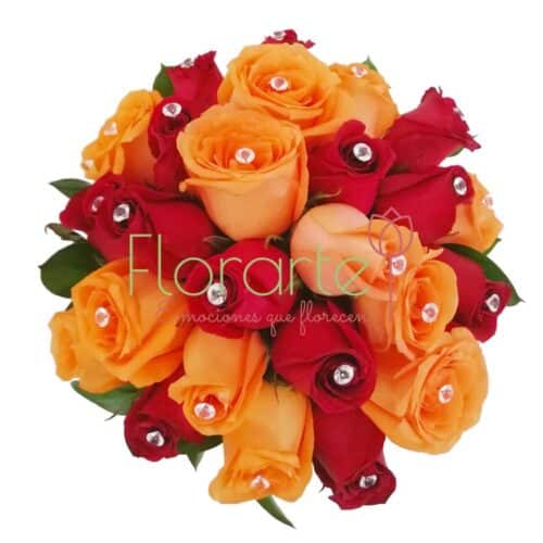 Envía Flores, diseño con una docena de Rosas rojas (12pzas) y una docena más de rosas de tono naranja (12pzas) con alfileres cabeza de diamante (fantasia), con follaje de Ruscus, en nuestra base babel.