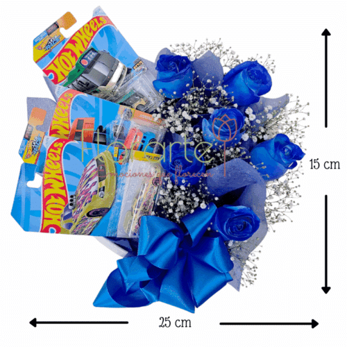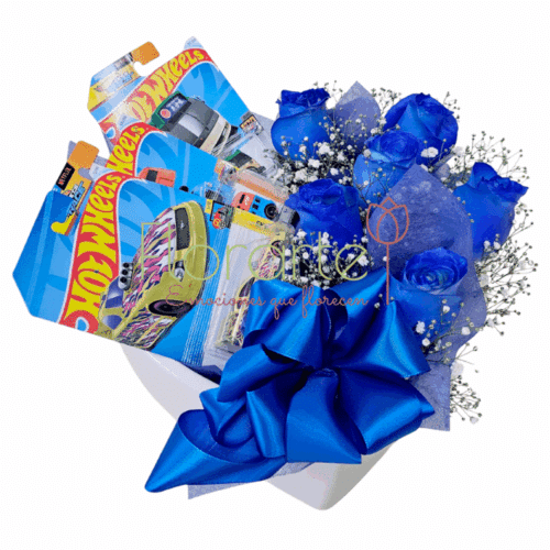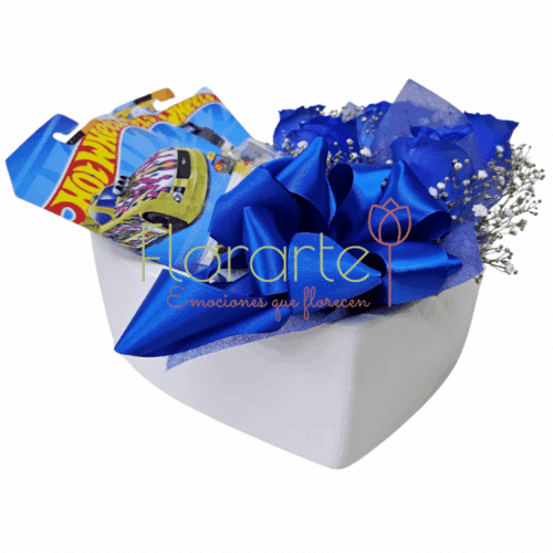 ¿Hambre de diversión? Tu Corazón de Hot Wheels con Papas está listo para entrega a domicilio el 30 de agosto y el Día del Novio. Envía Flores y Hot Wheels con este diseño elaborado con 3 Carros de Hot Wheels y 6 Rosas Azules (pintadas) entre Flor de Baby blanco en nuestra hermosa base de cerámica blanca en forma de corazón con un moño de tela azul. ¡El match perfecto entre juego y sabor!