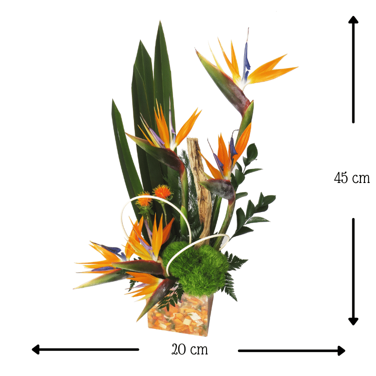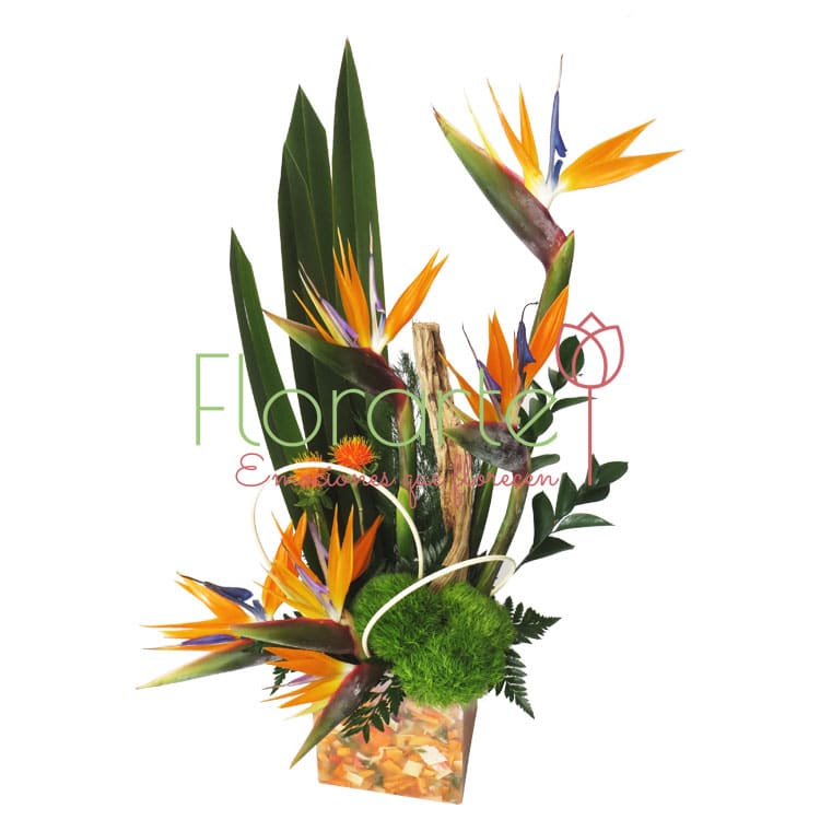 ¿Flores a Domicilio? Más que eso, regala este elegante diseño floral minimalista elaborado con media docena de Aves del Paraíso, tres tallos de Green, flor de Campanilla Irlandesa y troncos secos en nuestra base de cera Florencia. ¡Le fascinarán!