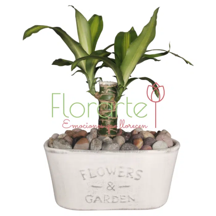 Inicia o alimenta su espacio verde, vital, con una duradera y bonita planta de palo de Brasil en nuestra base de cerámica Flowers and Garden con piedra de río.
