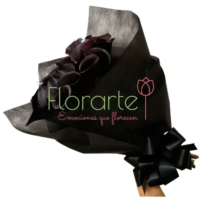 Ramo exclusivo y exótico, una decena de flores de Calas en tono berenjena, cubierta por papel en color negro y un moño.