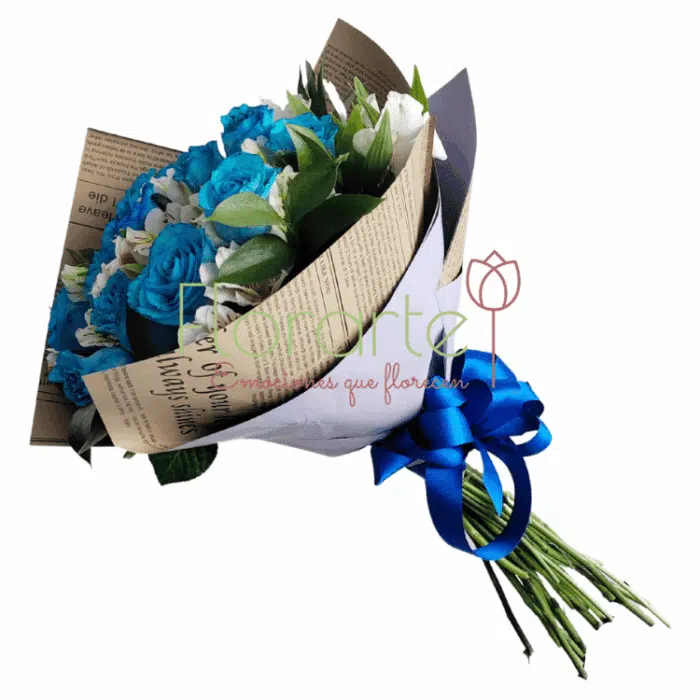 Ahora les toca a ellos recibir sus flores azules. Envía flores hermosas con nuestro ramo elaborado con 1 docena de Rosas de invernadero azules (pintadas) entre flores de Alstromelias blancas que hacen un contraste perfecto, abrazadas por papel decorativo tipo Kraft y un moño de listón azul.