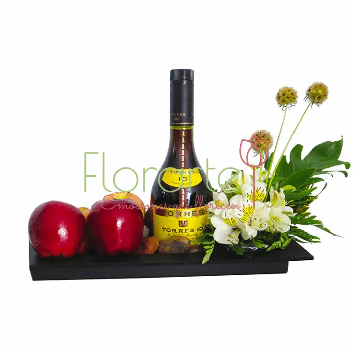 ¡Regala flores y vino. Sólo en Florarte, los mejores diseños! Elagnte arreglo con una Botella de Torres 10 de 700 ml. Acompañado de 4 Manzanas, un toque de Alstromelias, Escabiosas y finos follajes en una base de mdf cuadrada fondeada con piedras de rio.
