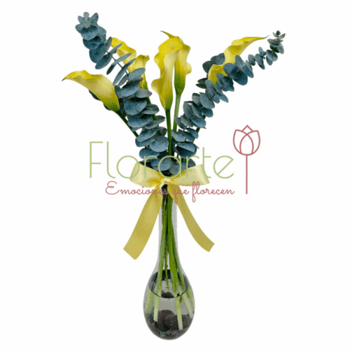 Celebra el 21 de septiembre de una forma inolvidable. Regala flores con este inolvidable arreglo de flores en florero de vidrio tipo gota, con 5 Flores de Calax amarillas entre un toque de follaje de Dólar y un moño de tela, y el florero fondeado con piedras de rio. ¡No esperes más! Haz clic aquí y compra este detalle perfecto para iluminar el día de alguien especial.
