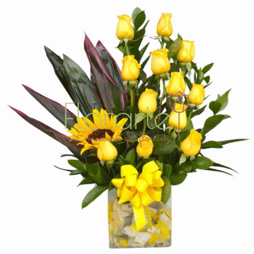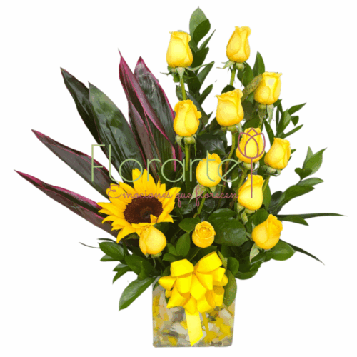 La elegancia de las rosas y los girasoles hacen una combinación perfecta para regalar flores a tu ser amado, amiga, familiar o a esa persona especial que quieres tener en tu vida por el resto de tus días. Bello y bonuito arreglo elaborado con 1 docena de Rosas amarillas, 1 Girasol con follajes para adornarle en nuestra elegante base de cera con sachet y un moño de tela amarillo.