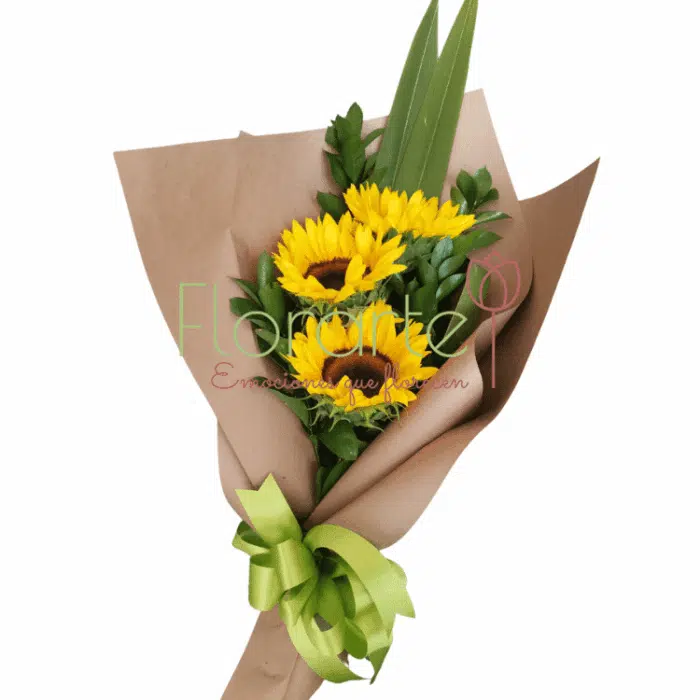¡No busques más, el regalo perfecto está aquí! Envía flores amarillas que iluminen su día. Sencillo pero precioso ramo elaborado con 3 Girasoles, un toque de Fornios y Ruscus abrazados por papel Kraft y un moño de listón verde. ¡No esperes más para compartir este mensaje de luz y felicidad!