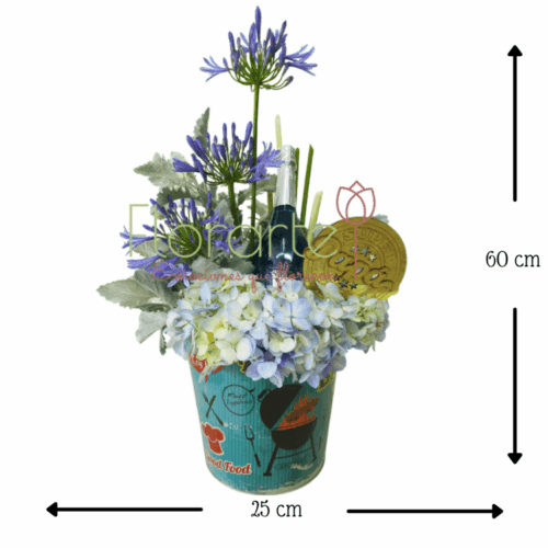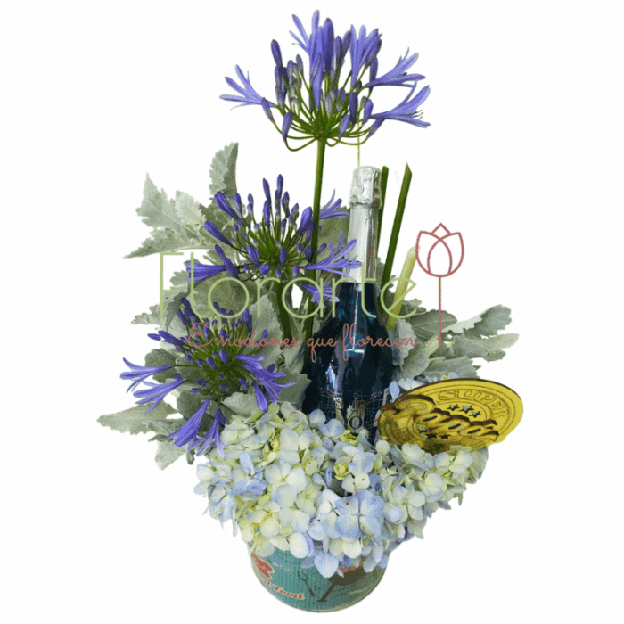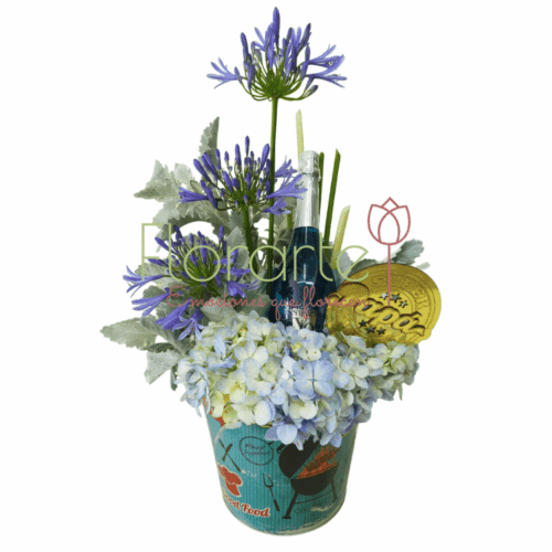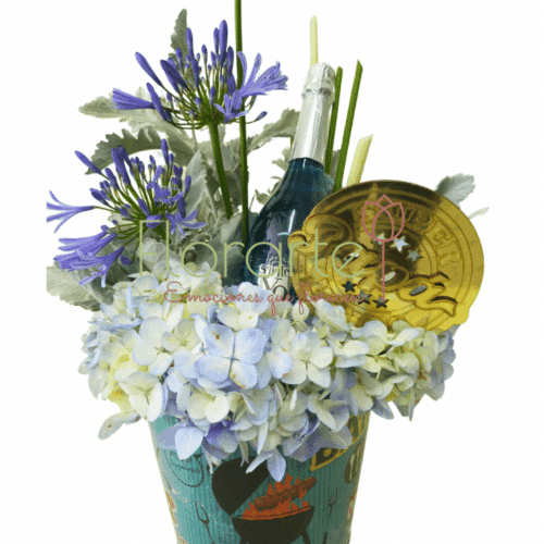 Este día del padre, sorprendelo con un gran detalle de Florarte. Regala flores y algo más con este bello arreglo elabotrado con 1 Botella de Vino Espumoso Santo Yo 750 ml Blue, 3 Flores de Agapandos azules, un toque de Miller, Hortensia azulada y un letrero de mdf en nuestra cubeta tipo hielera de aluminio decorada.