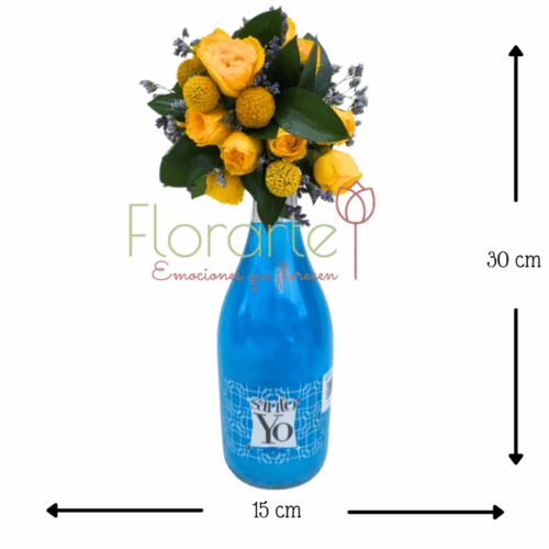 Más que un regalo para papá, un sentimiento que se entrega a domicilio. Esté día del padre regala amor y delicadeza a Papá con este bello arreglo elaborado con una botella de Vino Espumoso Santo Yo 750 ml Blue con un toque de flores en la boca de la botella de Rosas Baby amarillas entre Ruscus y un toque de Limonium morado.