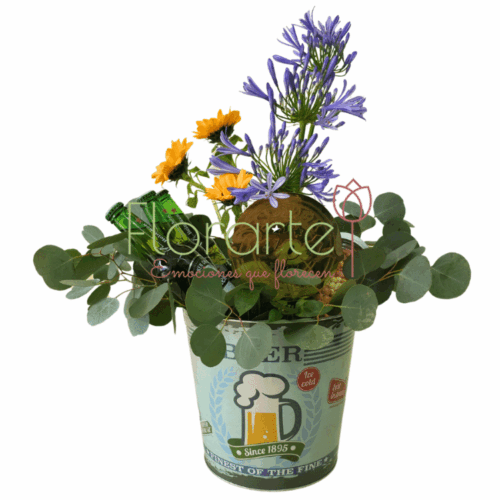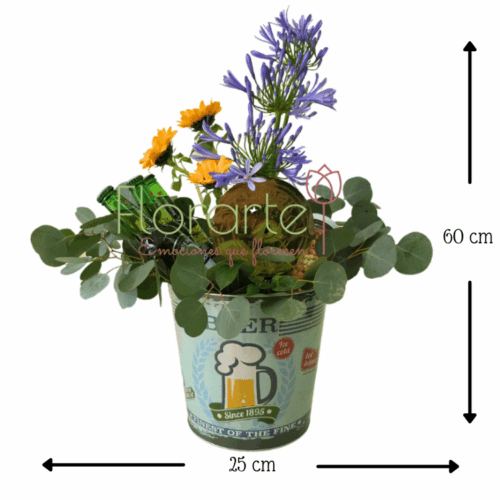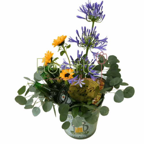 Este Día del Padre, no solo lo felicites, ¡sorpréndelo! Haz de este un día inolvidable y envíale flores a domicilio. Regala flores con este arreglo elaborado con 3 Cervezas Cervezas Heineken, 3 Mini Girasoles entre 3 Agapandos entre follaje de Dólar Papalo con 1 Fransco de Surtido de Cacahuates con 1 letro de mdf en una cubeta tipo hielera de aluminio decorada.