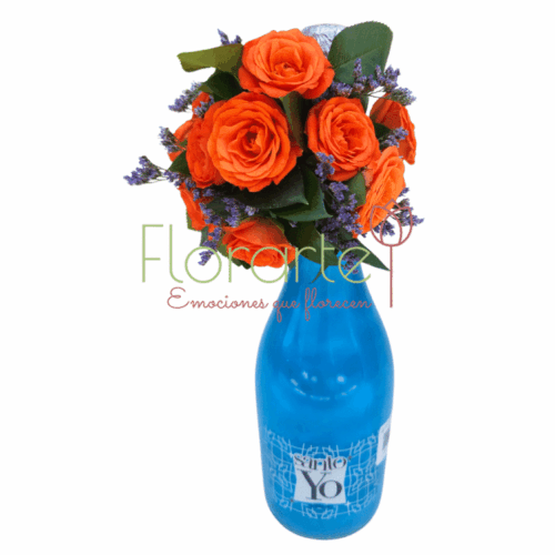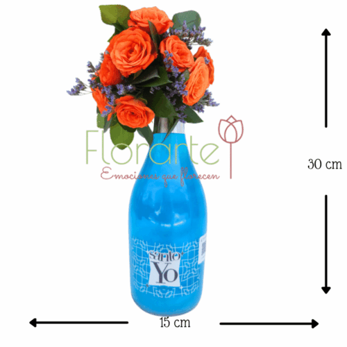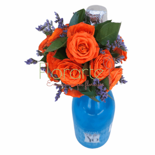 La alegría de Papá florece al recibir un detalle en su día. Envía flores esté día del Padre con esta elegante y rica botella de Vino Espumoso Santo Yo 750 ml Blue con Rosas Baby Naranjas con un toque de Ruscus en la boca de la botella que el adornará.