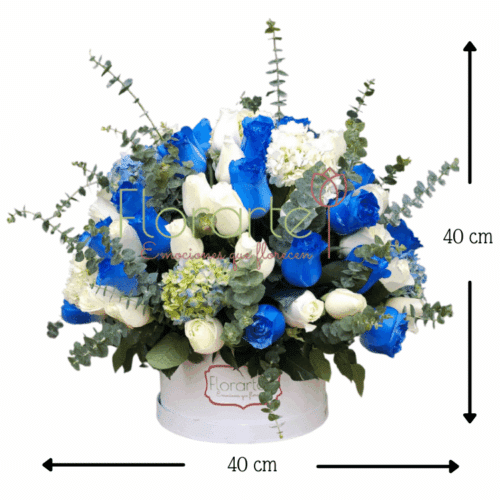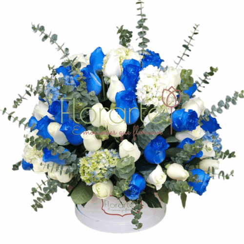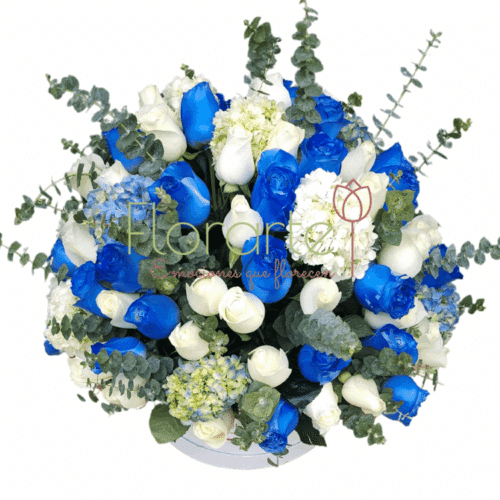 Envía flores a tu persona favorita con sus colores favoritos. Hermoso diseño que seguro le encantará recibir, elaborado con 72 Rosas de Invernadero, 3 docenas de Rosas Blancas y 3 docenas más de Rosas azules (pintadas) entre Hortensia Azul y Blanca y follaje de Dolar para su combinación perfecta en nuestra base de mdf blanca.