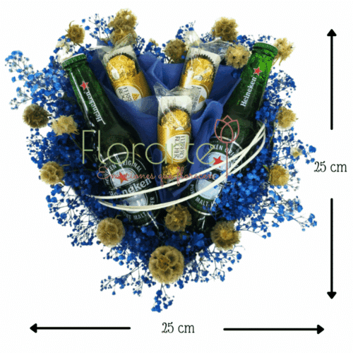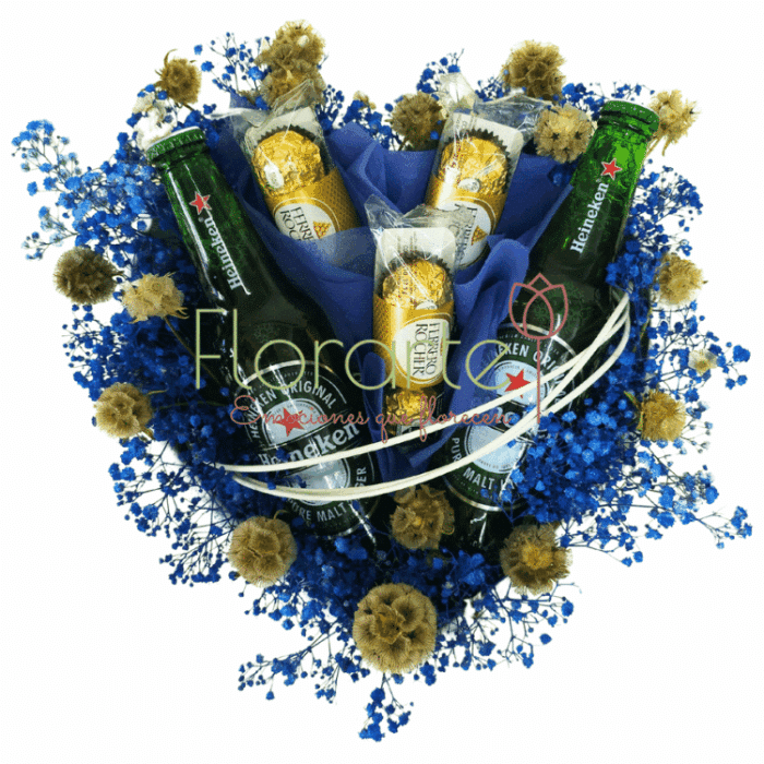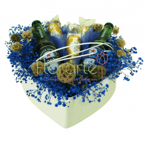 Celebra a papá en su día con un detalle inolvidable. Regala flores a domcilio porque ellos también lo merecen, arreglo elaborado con 2 Cervezas Heiniken entre Flor de Baby azul, 3 Paq. De Ferrero, cada uno con 3 Chocolates, 10 Varas de Escabiosas con papel en nuestra base de cerámica en forma de corazón.