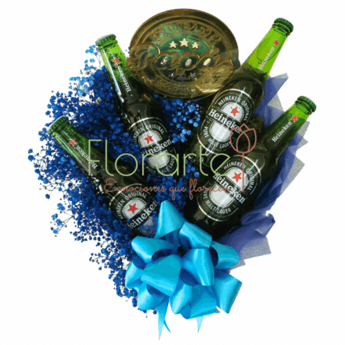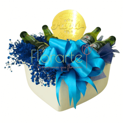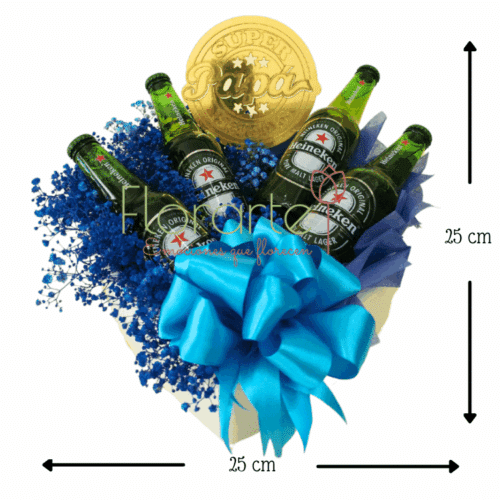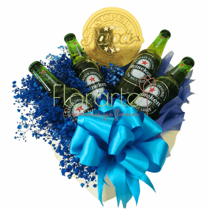 Regala flores a Papa en su día. Este gran detalle solo una pequeña muestra del gran amor y agradecimiento por todas sus enseñanzas. Arreglo elaborado con 4 Cervezas Cervezas Heineken posadas entre flor de Baby azul (pintada) en nuestra base de cerámica blanca en forma de corazón, papel decorativo azul, 1 Moño de tela azul y 1 letrero de mdf.