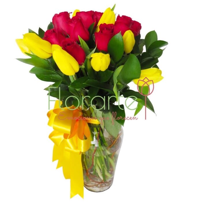 ¡Regala flores que emocionan! Una decena de hermosos Tulipanes barcelona con una docena de Rosas de invernadero rojas, en un florero de vidrio fondeado con Curly Wilow y gravilla de mármol. Disfrutará de la magia de los Tulipanes que enviamos tan frescos que podrá apreciar su transformación de color y crecimiento de flor y tallo aún cortados.