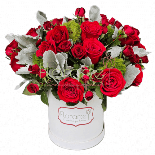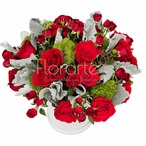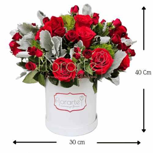 “Un regalo que cautiva a primera vista. Este arreglo floral, con rosas rojas de invernadero y rosas baby, es una obra de arte. La combinación de colores y texturas, junto con la base de cilindro de MDF blanca, crea un diseño elegante y sofisticado. Envía flores y deja una impresión eterna en su ser.”