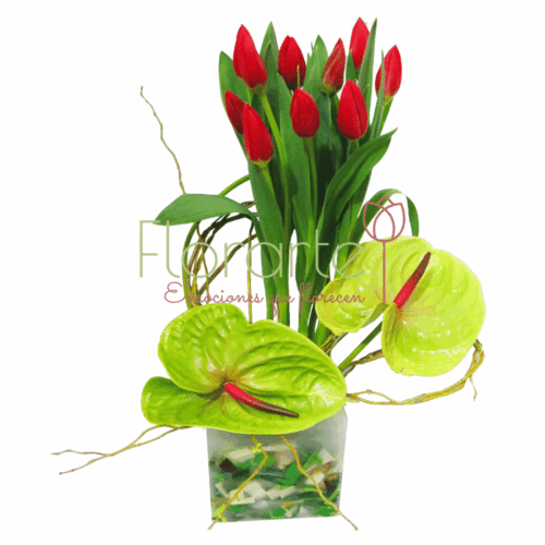 Un diseño elegante y sencillo que le encantara, una decena de Tulipanes rojos y dos Anturios verdes abrazados por Curly Wilow en nuestra base especial de cera marmoleada con naturaleza muerta.