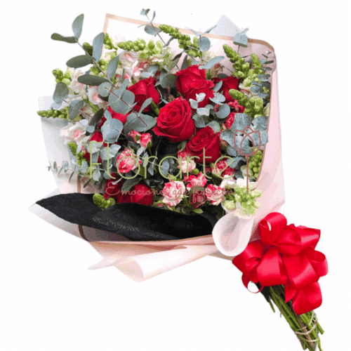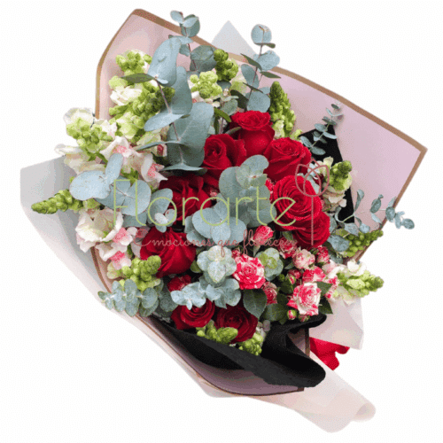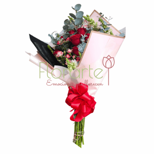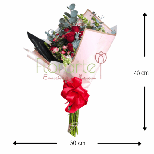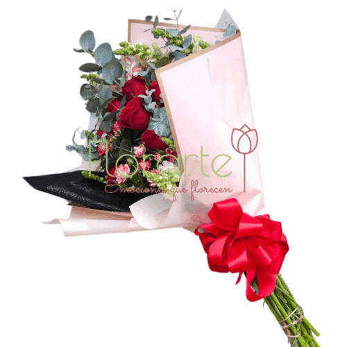 Ya llegará quien te regale flores, sólo por existir. Envía flores hermosas con nuestro ramo elaborado con 12 Rosas Rojas de invernadero entre Rosas Baby bicolor acompañado de 15 Dragonarias rosas con blanco, con papel y un moño de tela para adornarle.