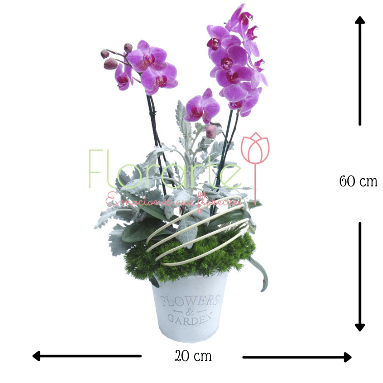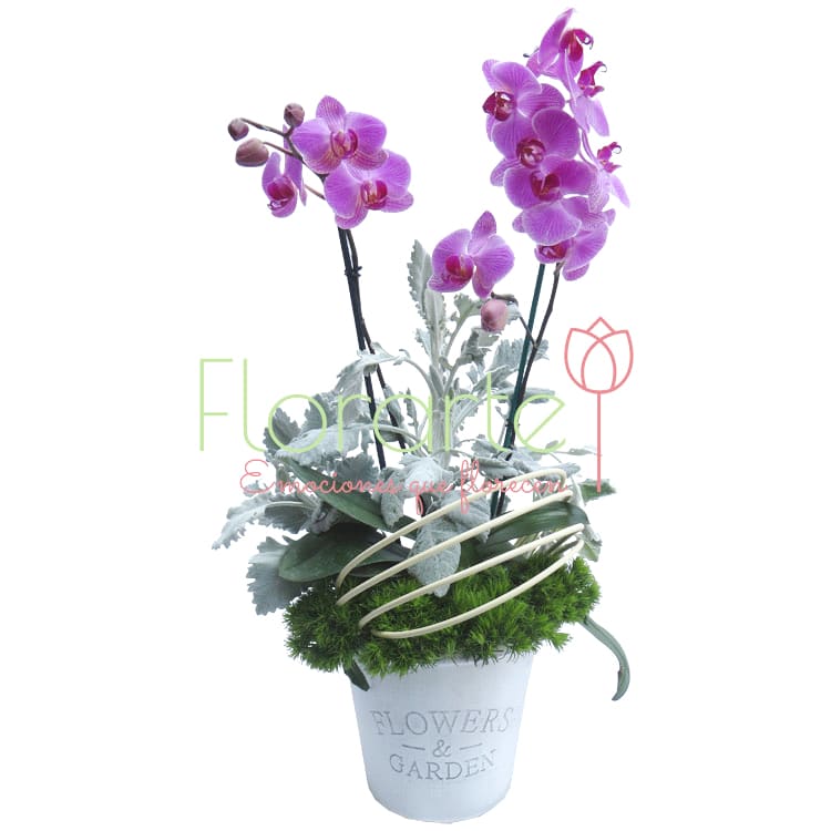 ¡Envía más que flores a domicilio! Una bella planta de Orquídea Phalaenopsis de doble tallo, entre follaje gris Miller y flor de Green al píe de los tallos en nuestra base Flowers and Garden.