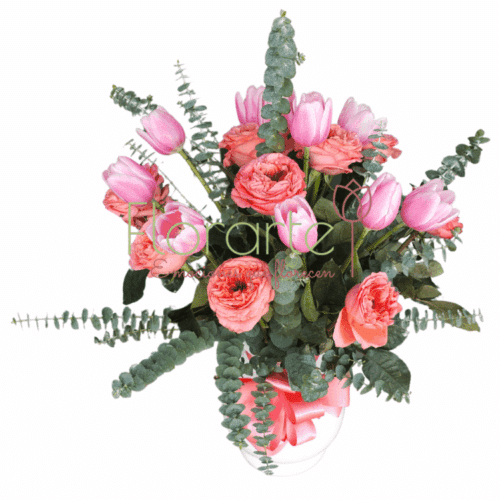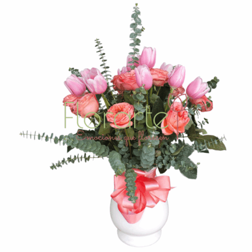 ¡Regala flores exclusivas para consentir a tu persona favorita! Elegante y espectacular arreglo elaborado con una decena de Rosas Inglesas acompañadas de 1 decena de Tulipanes Rosas con follaje de Dólar en una elegante base de cerámica blancacon un moño de tela.