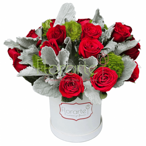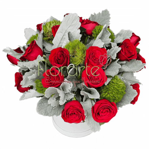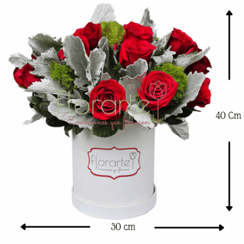 Envía flores llenas de amor. Elegante arreglo elaborado con 2 docenas de Rosas rojas de invernadero entre Green y un toque de Miller grisaceo en nuestro cilindro de mdf blanco.