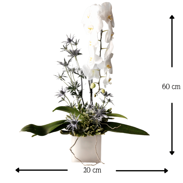 Excelente y elegante diseño con una Planta Phalaenopsis Premium de un tallo blanca entre follaje de Eryngio y clavo japonés en una base de cera.