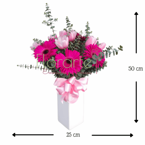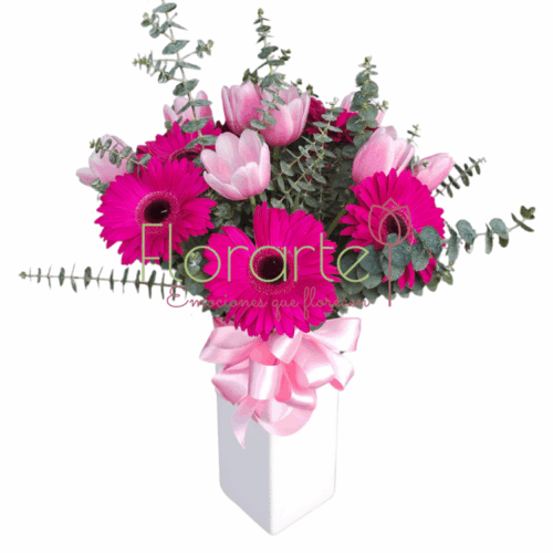 ¡Envía Flores de cariño, duraderas y preciosas! Bonito arreglo elaborado con 1 decena de Gerberas Fiusha con 10 Tulipanes rosas entre Dólar en nuestra base de cerámica blanca con un moño de tela.