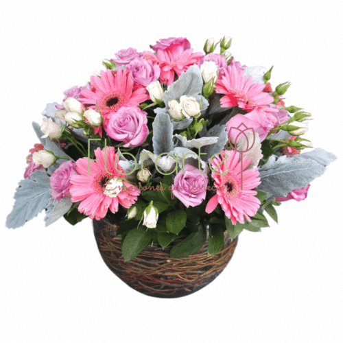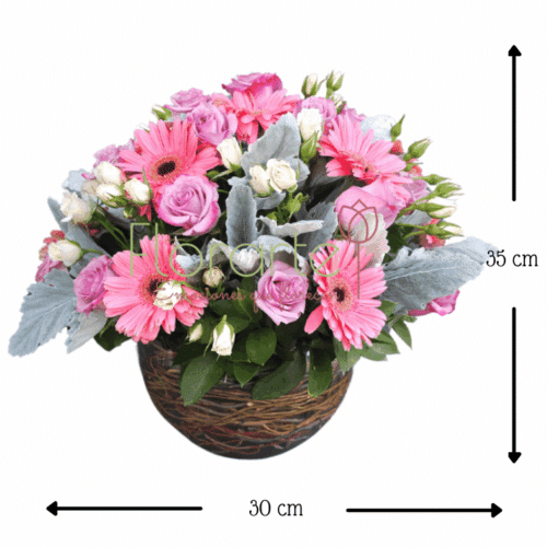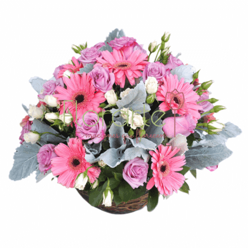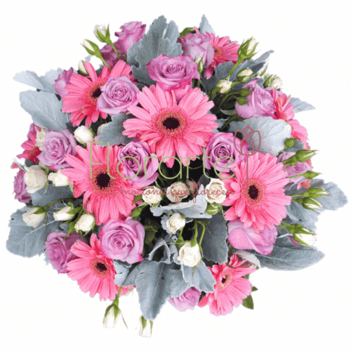 Haz sonreír a alguien especial hoy. Envía flores de Florarte y comparte alegría. Bello arreglo elaborado con 24 Rosas de Invernadero Lilas, 10 Gerberas rosas entre Rosas Baby Blancas entre Miller y Ruscus en nuestra base de vidrio estilo pecera con Curly Willow que le adorna al fondo.