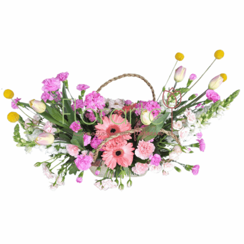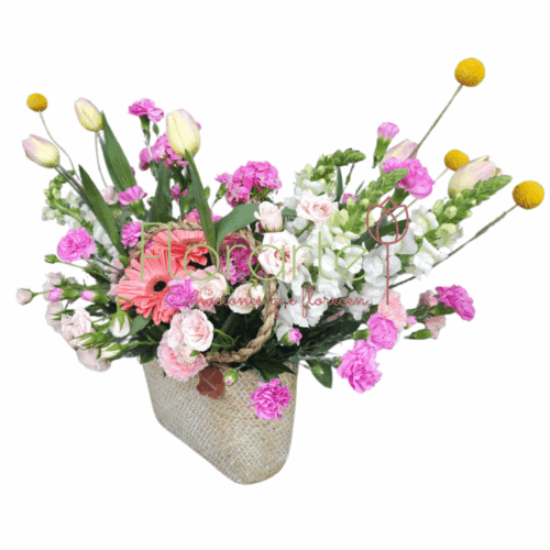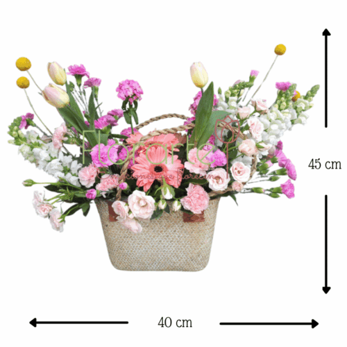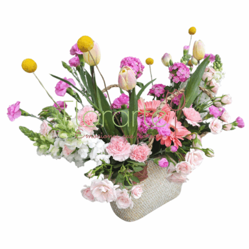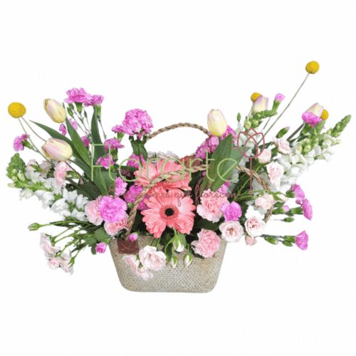 ¡El corazón de mamá florece con amor! Envía la belleza de nuestras flores a domicilio y regálale un detalle inolvidable. Precioso arreglo de flores elaborado con 5 Tulipanes rosario, 3 Gerberas en tono rosa, 4 Claspedias, Rosas Baby rosa, 6 Dragonarias blancas, Clavel en tono rosa y fiusha en nuestra bolsa tejida.